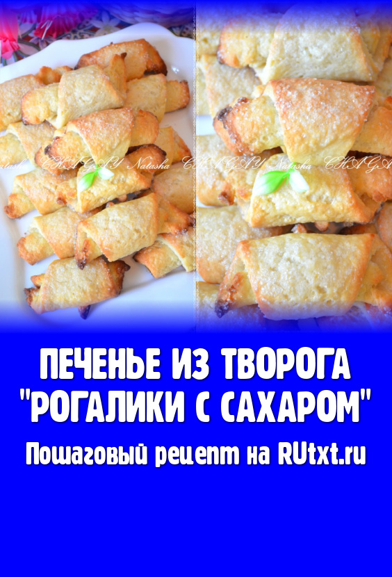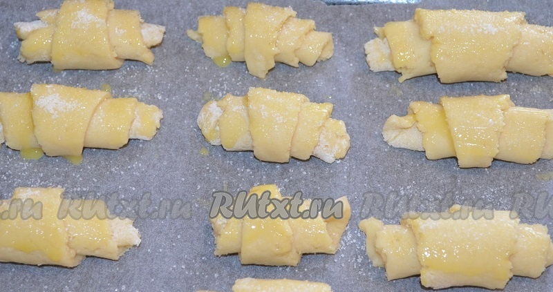 Выложить рогалики на противень, застеленный пергаментом, смазать поверхность молоком и посыпать сахаром (благодаря сахару, корочка будет более хрустящей). Выпекать печенье из творога в разогретой духовке при температуре 200 градусов минут 20-30 (до золотистого цвета).