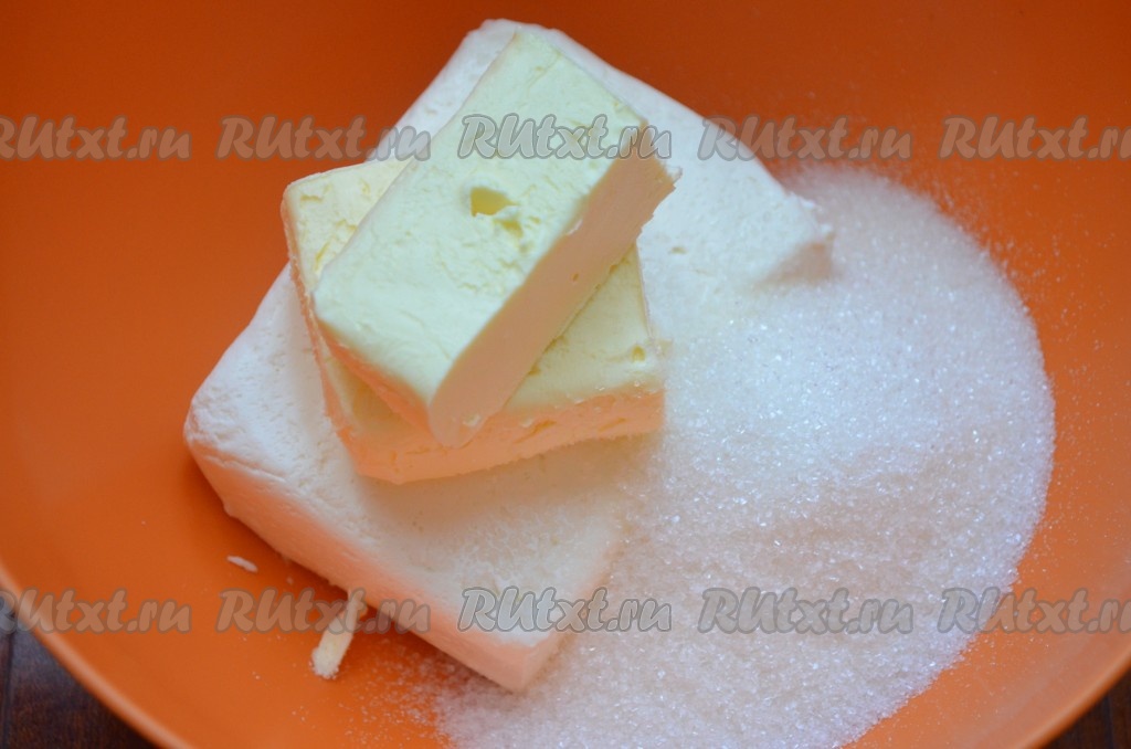 Сливочное масло заранее достать из холодильника, чтобы оно согрелось до комнатной температуры и стало достаточно мягким. В миске соединить творог, размягчённое сливочное масло, сахар и ванилин перетереть вилкой (или лопаткой) до получения однородной массы.