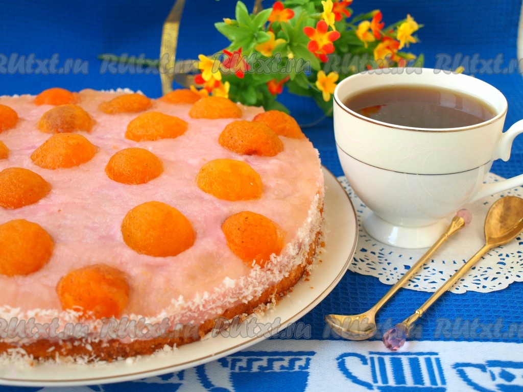 Желе для торта развести согласно инструкции на упаковке. Полить им сначала абрикосы, а затем весь торт. Убрать торт с кремом из пудинга для застывания и пропитки в холодильник на несколько часов. Спустя это время бисквитный торт прорезать ножом по кругу формы и снять кольцо. Бока торта, по желанию, посыпать кокосовой стружкой.