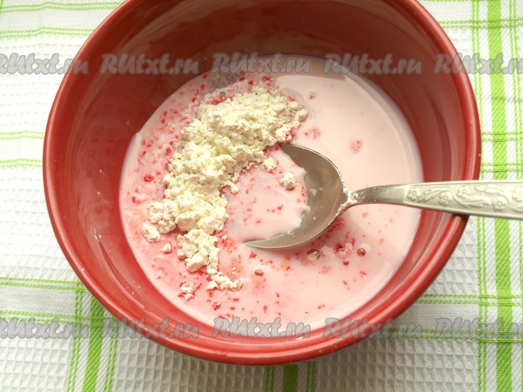 Теперь приступим к приготовлению крема. Для этого нужно сухой пудинг высыпать в миску, добавить сахар и 6 столовых ложек молока, хорошо перемешать пудинг.