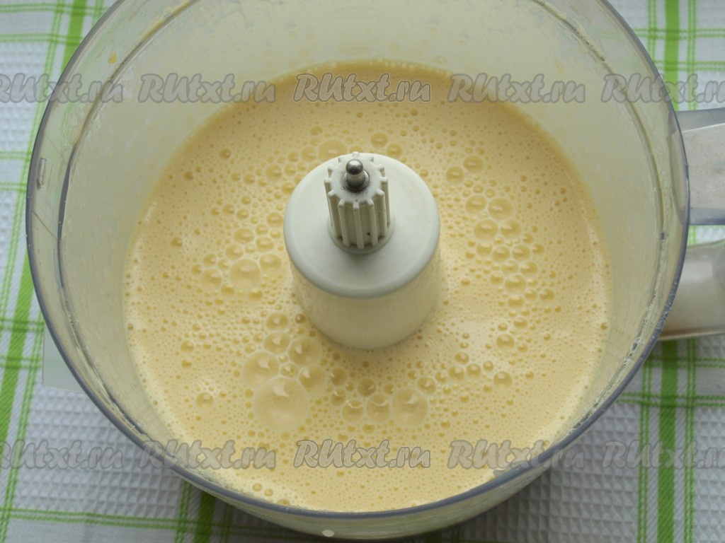 Приготовление торта начнём с выпекания бисквита. В чашу комбайна (или в чашу, в которой будет удобно взбивать миксером) разбить яйца. Начать взбивать яйца в комбайне (или миксером), постепенно добавляя сахар. Взбивать яйца с сахаром нужно в течение 6-7 минут (до увеличения яичной массы в объёме в 2 раза).