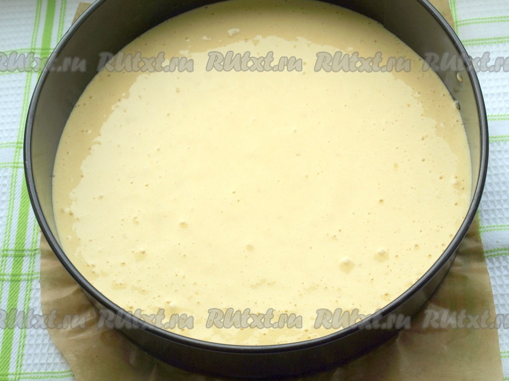 Дно разъёмной формы для выпечки застелить бумагой для выпечки. В центр формы вылить тесто.