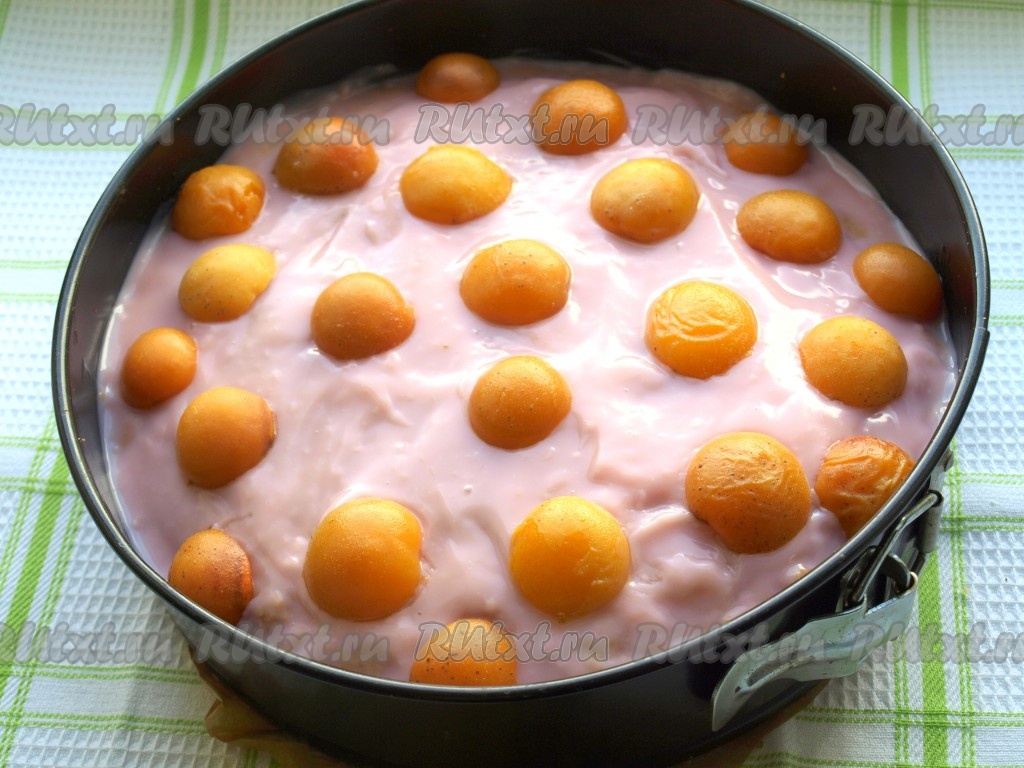 Накрыть вторым бисквитом, сверху равномерно распределить оставшийся пудинг. Поверх него разложить абрикосы срезом вниз.