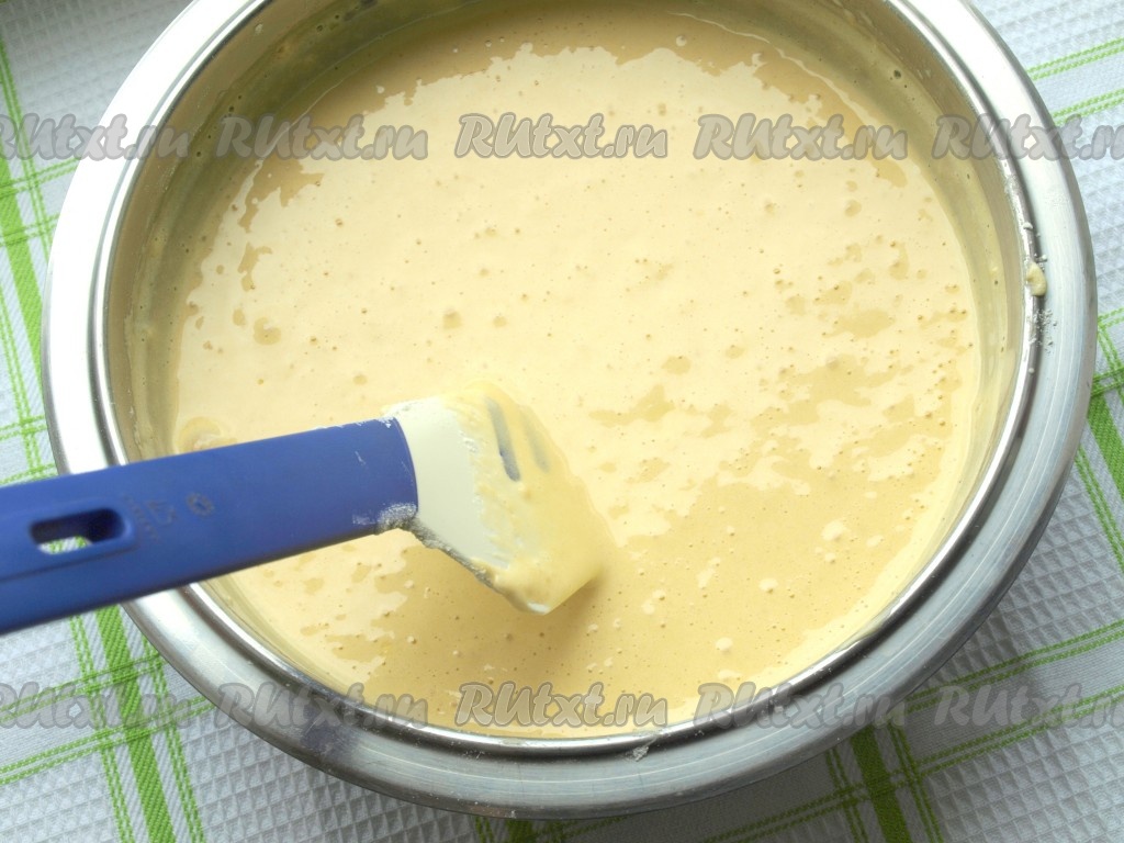Перелить яичную массу в миску, частями начать добавлять просеянную муку, каждый раз полностью вмешивая движениями лопатки снизу вверх.