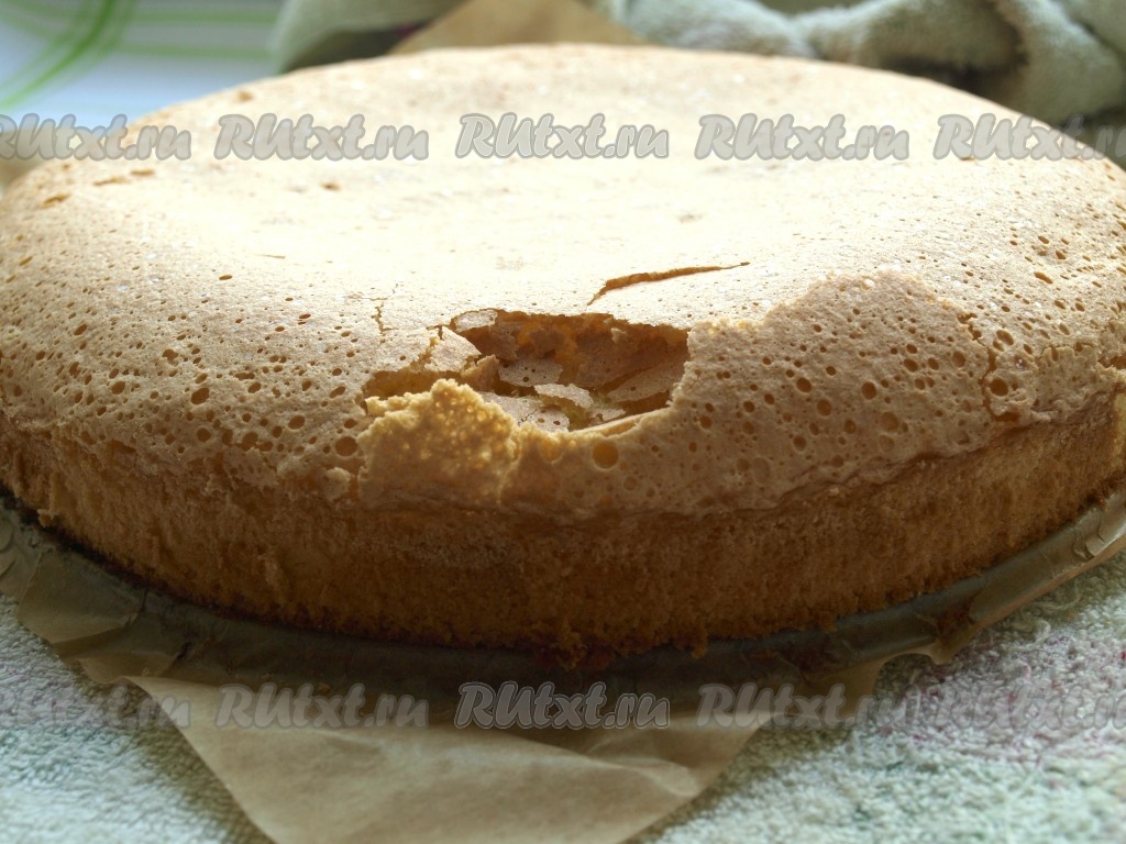 Разогреть духовку до 170 градусов и выпекать бисквит 30 минут. Для того чтобы проверить готовность, проколите бисквит сверху сухой деревянной шпажкой, если после прокалывания на шпажке не будет следов теста, она останется сухой, значит выпечка готова. Вынуть готовый бисквит из духовки, дать слегка остыть в форме, а затем, вынув из формы, переложить на решётку и оставить остывать. Иногда на бисквите может получиться хрупкая корочка, которая легко снимается и бисквит остаётся нежным и мягким.
