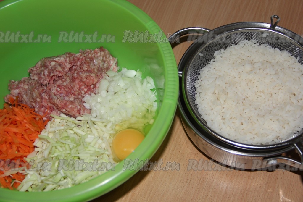 В большой миске соединить капусту, фарш, морковь, лук, яйцо, рис. Посолить, добавить приправы и всё хорошо перемешать.