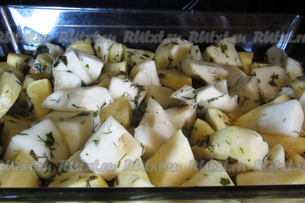 Репу выложим в форму для запекания, посолим по вкусу и польём заправкой. Хорошо перемешаем. Запекаем репу в духовке при 180-200 градусах около 1 часа.