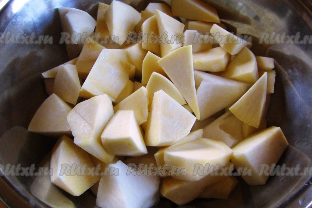 Репу вымоем, очистим от кожуры и нарежем крупными кусочками.