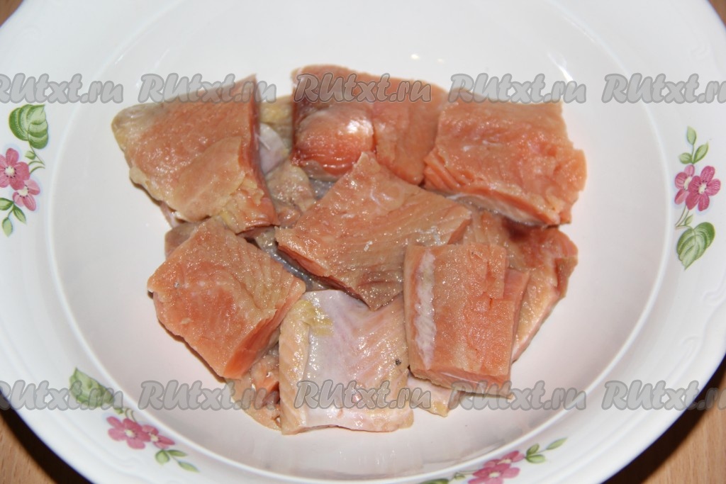 Филе горбуши, уже отделённое от костей и кожи, можно купить в магазине. А можно купить целую горбушу, слегка разморозить её, срезать филе рыбы вдоль хребта, затем удалить косточки и кожу. Филе горбуши полностью разморозить, нарезать на порционные кусочки, немного посолить и поперчить.