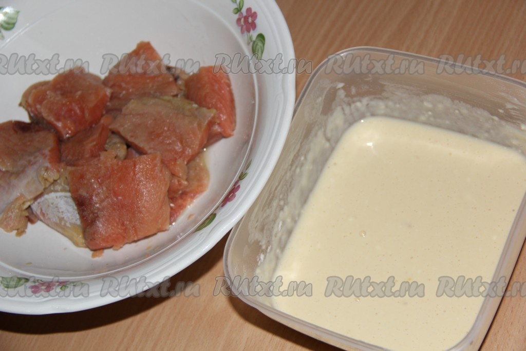 Для приготовления кляра венчиком взбить яйца с солью до однородности, затем добавить молоко и 50 грамм муки, перемешать до однородности. Частями добавить оставшуюся муку, замешивая однородный, в меру густой кляр. Кляр не должен быть очень густым или очень жидким, он должен хорошо держаться на кусочках филе горбуши.