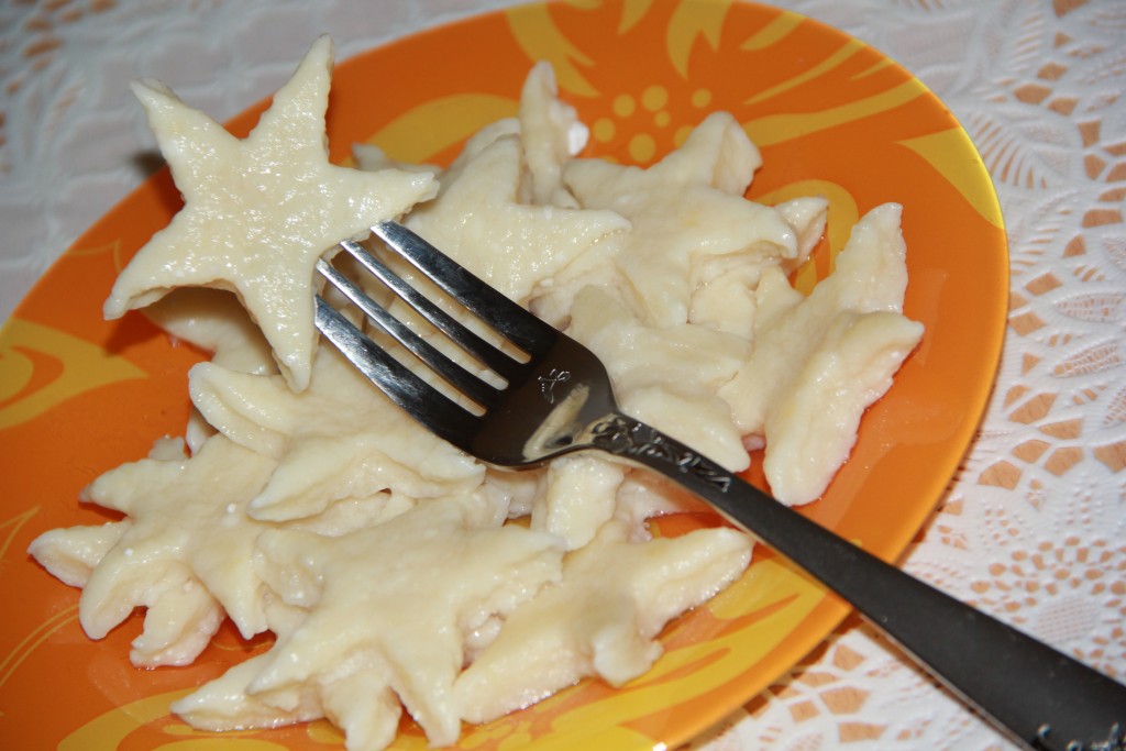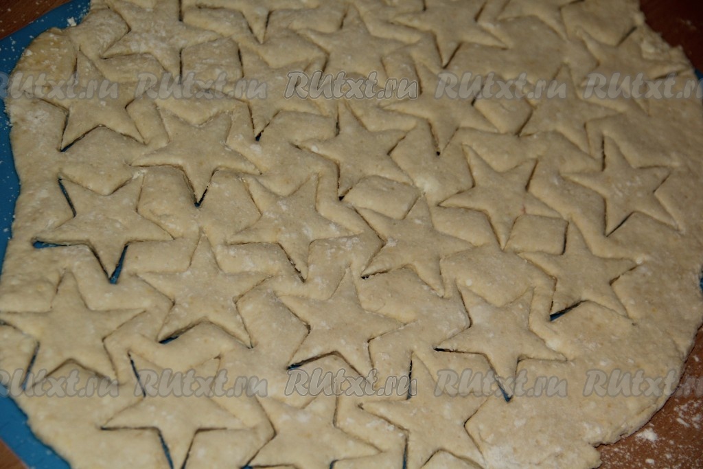 На поверхности, припорошенной мукой, раскатать творожную массу скалкой (не тонко!). Вырезать с помощью формочек заготовки ленивых вареников. Я сделала вареники в форме звёздочек. А можно просто нарезать раскатанное тесто ножом на квадратики.