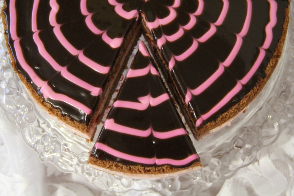 Верх вкусного бисквитного торта с суфле украсить по желанию. Я в небольшое количество сметаны добавила пару капель свекольного сока и хорошо перемешала. Затем нанесла сметану в виде рисунка на поверхность глазури.