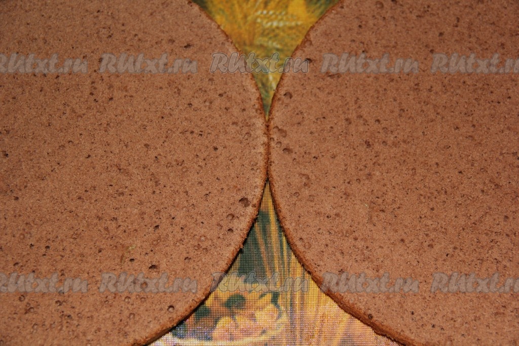 Поставить форму с тестом в заранее разогретую духовку и выпекать при температуре 180-200 градусов примерно 35-40 минут. Готовность проверить сухой зубочисткой. Готовый корж хорошо остудить и разрезать на две части.