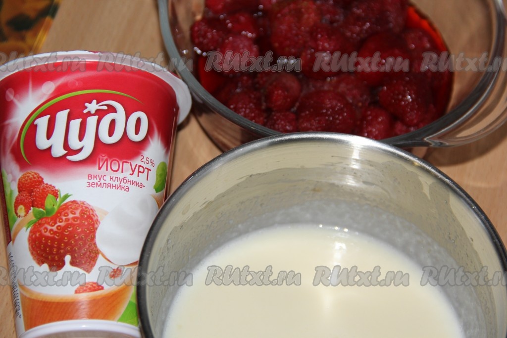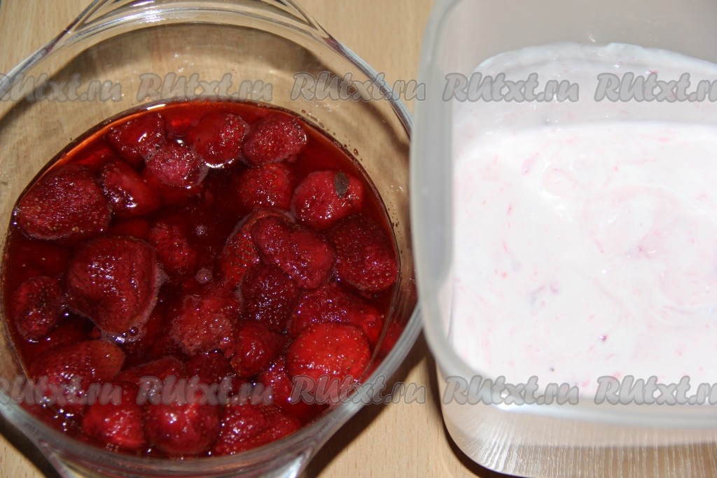 Приготовить суфле: желатин залить молоком и оставить набухать. Клубнику разморозить. Йогурт соединить со сметаной, добавить сахар и хорошо перемешать. Желатин поставить на огонь и прогреть до полного растворения (не кипятить!).