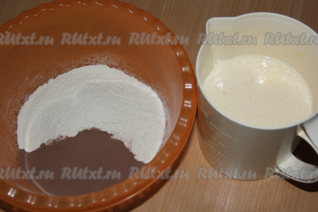 Для начала приготовить бисквит. В высокую миску просеять муку, добавить какао. Отделить белки от желтков. Белки взбить в пышную пену, затем добавить сахар и хорошо взбить до стойких пиков. Далее, продолжая взбивать, ввести по одному желтки.