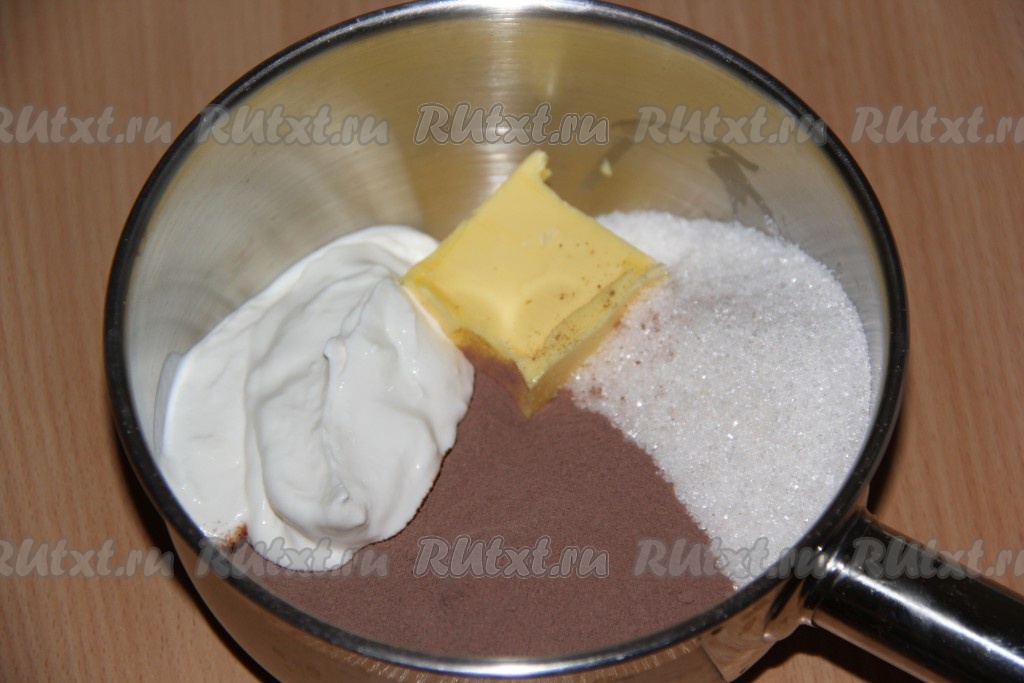 Приготовить глазурь: в небольшой кастрюле или ковшике соединить масло, какао, сахар, сметану. Поставить на огонь и довести до полного растворения сахара и масла. Немного остудить глазурь.