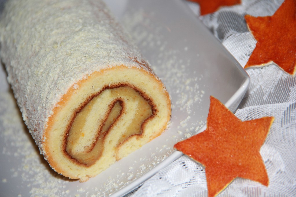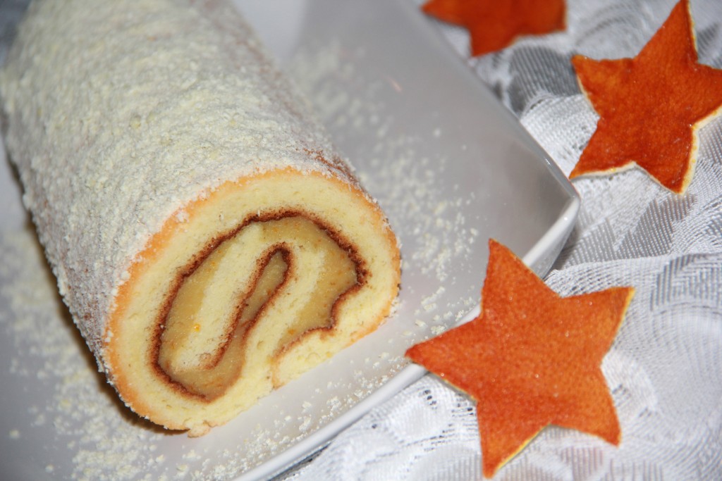Посыпать сахарной пудрой очень вкусный бисквитный рулет с заварным кремом.