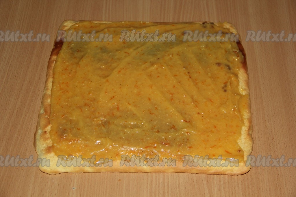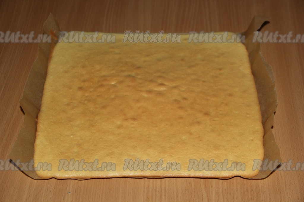 Пласт с бисквитом накрыть хлопчатобумажным полотенцем и быстро перевернуть. Снять пергамент. Смазать бисквит заварным кремом.