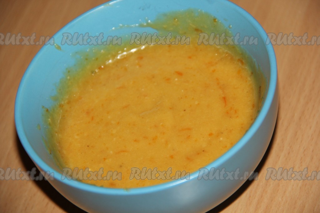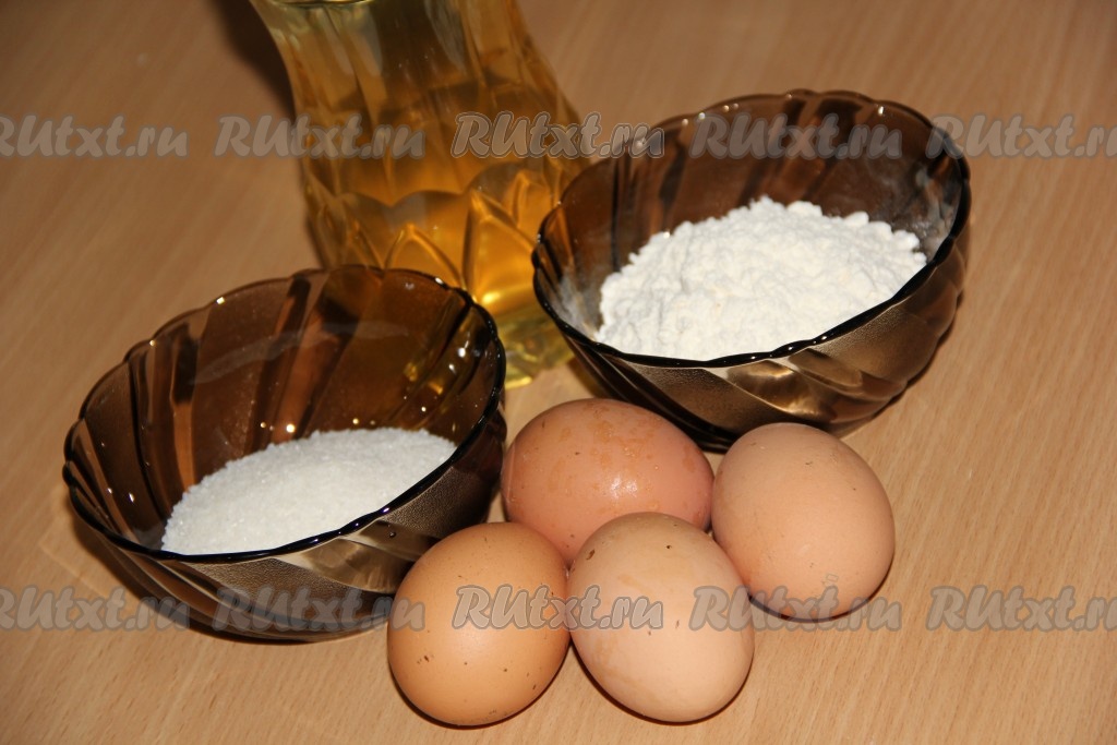 Затем добавить желтки и растительное масло, ещё раз взбить. Добавить просеянную муку в яичную смесь и аккуратно перемешать до однородной массы.