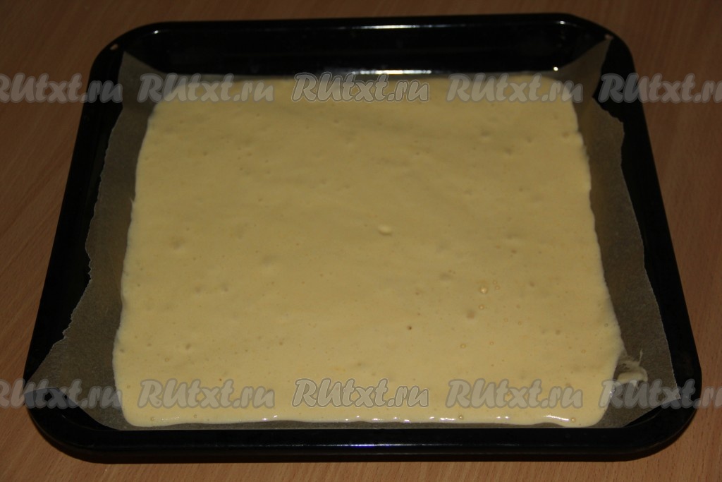 Противень для выпекания застелить пергаментом, слегка смазать растительным маслом. Вылить тесто на противень и разровнять.