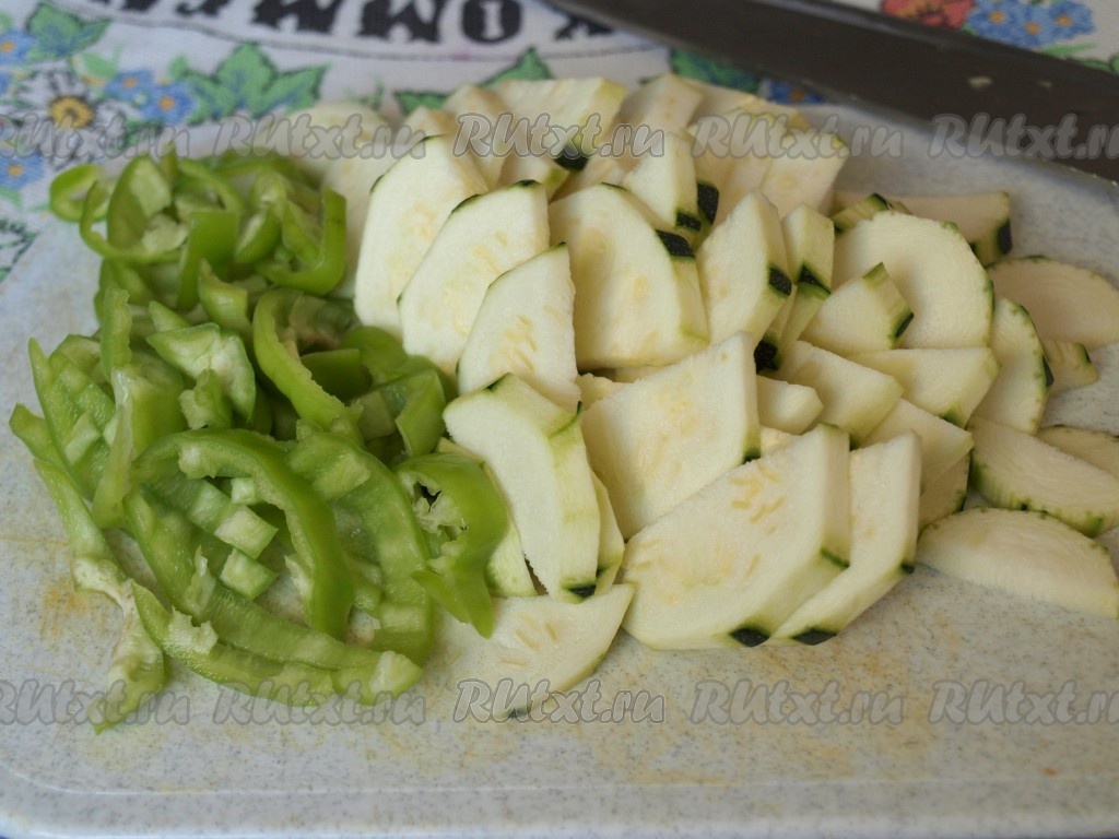 Если кабачок не очень молодой, удалить шкурку и семечки. Из болгарского перца удалить семена. Кабачок нарезать на четвертинки, болгарский перец - соломкой.