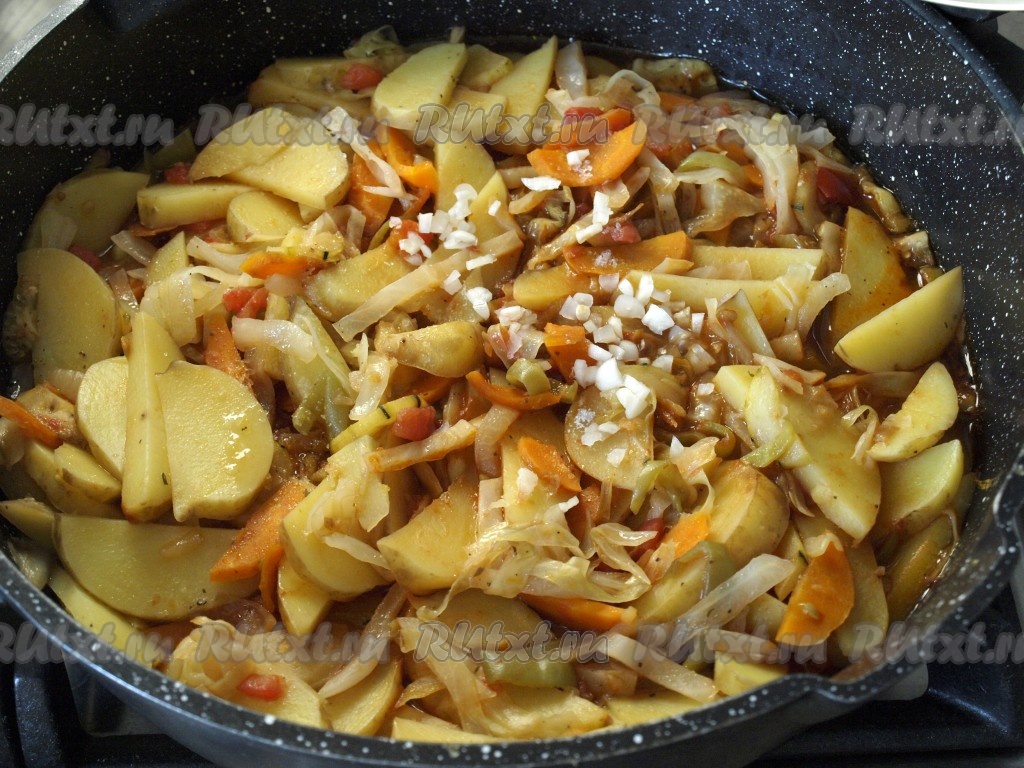 В конце приготовления в рагу из картофеля, кабачков и капусты добавить мелко нарезанный чеснок. Также можно добавить ароматные травы.
