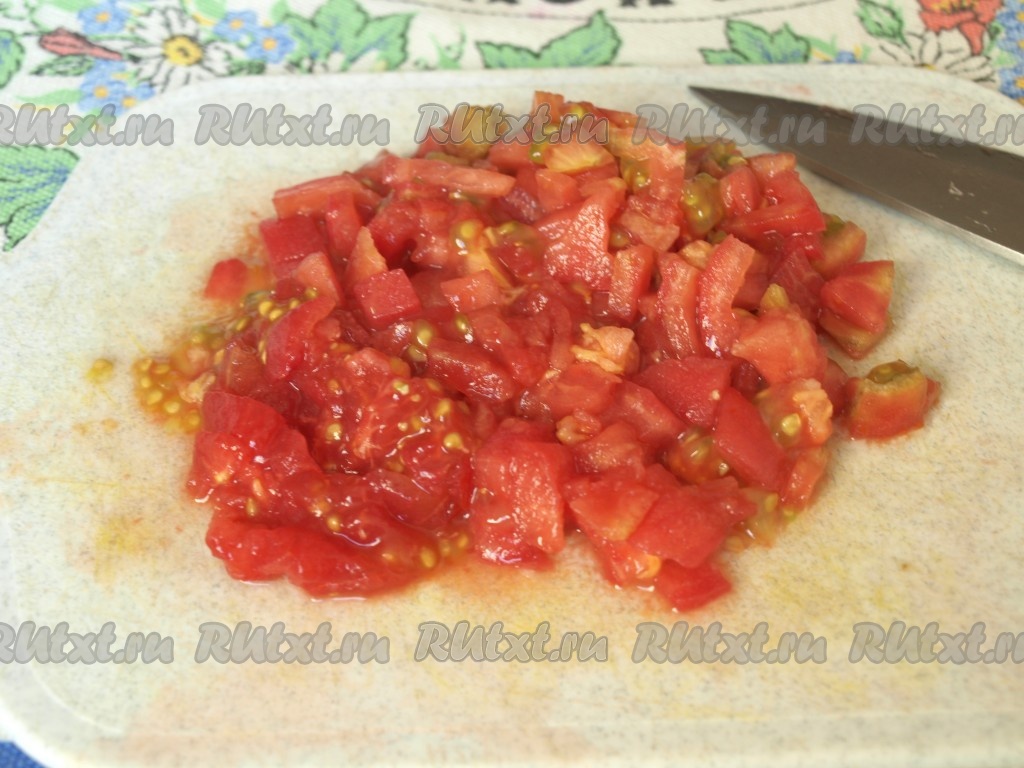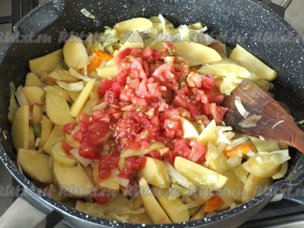 Следом добавить помидоры. Развести водой томатную пасту (на стакан воды - 1-2 столовые ложки пасты), влить жидкость в сковороду, посолить и поперчить по вкусу. Тушить до готовности картофеля.