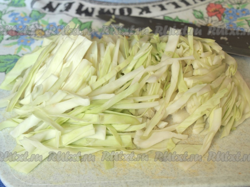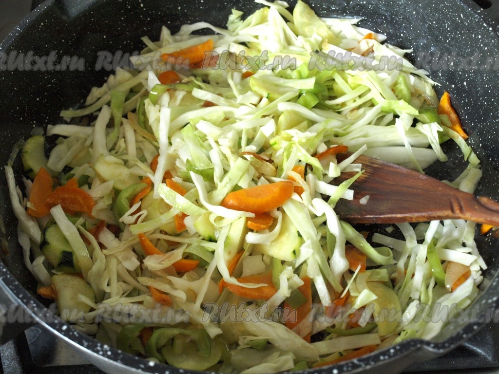 В сковороду к овощам добавить нарезанную капусту, перемешать.