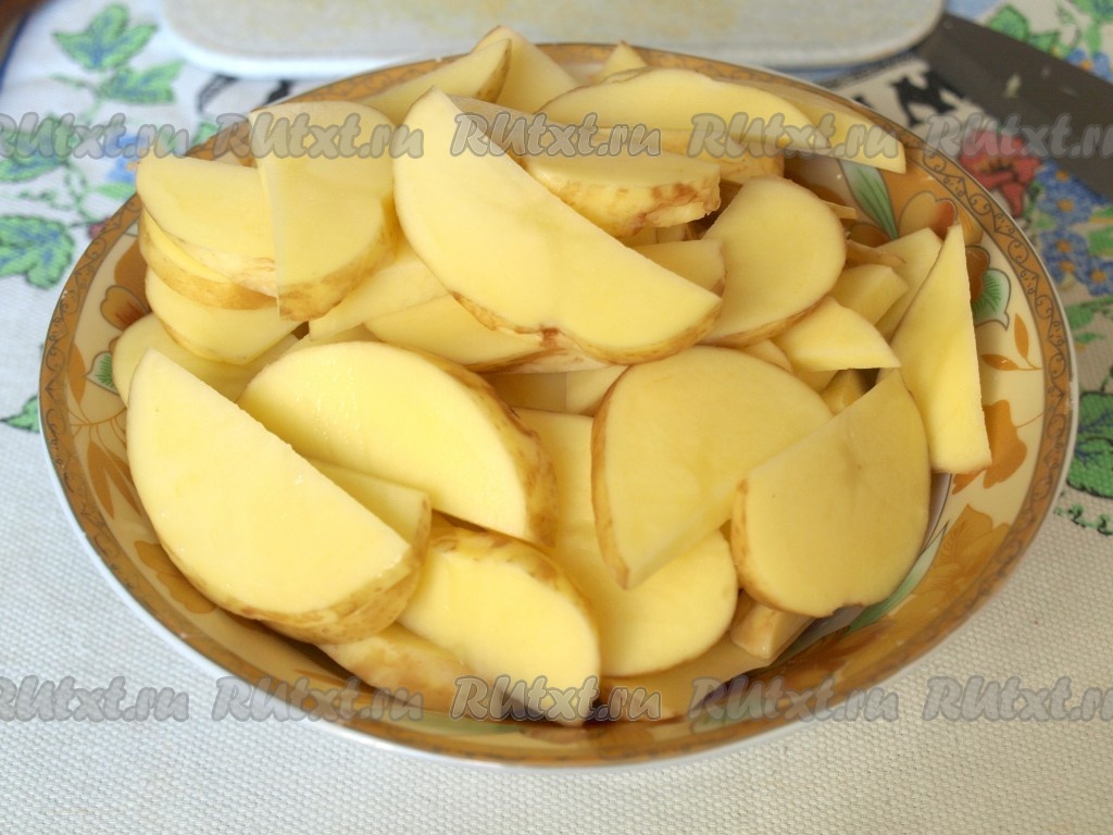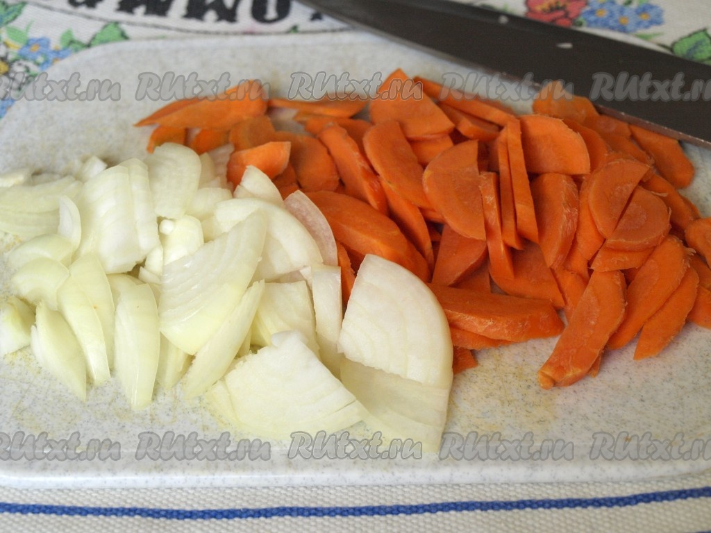 Очистить морковь и лук. Нарезать лук полукольцами, а морковь - полукружками.