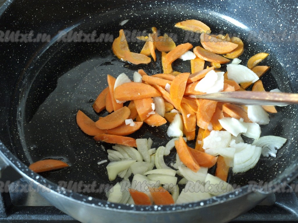 В сковороде разогреть подсолнечное масло. Немного обжарить лук с морковью.