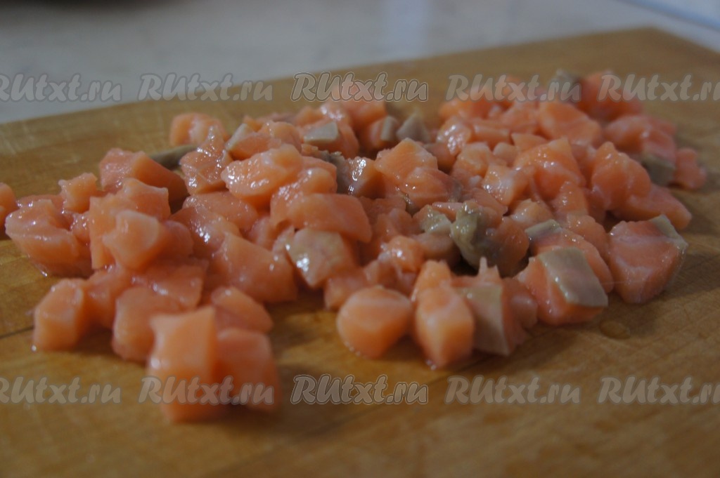 Сёмгу моем. У меня было филе сёмги, его нужно будет нарезать на небольшие кубики. Если вы взяли сёмгу на кости, тогда нарезать её на части перед варкой не нужно, так и оставьте её на кости.