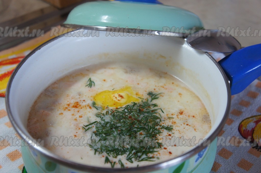Вкусный, насыщенный суп, сваренный из сёмги с плавленным сыром, разливаем по тарелкам и подаём к столу.