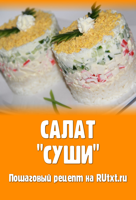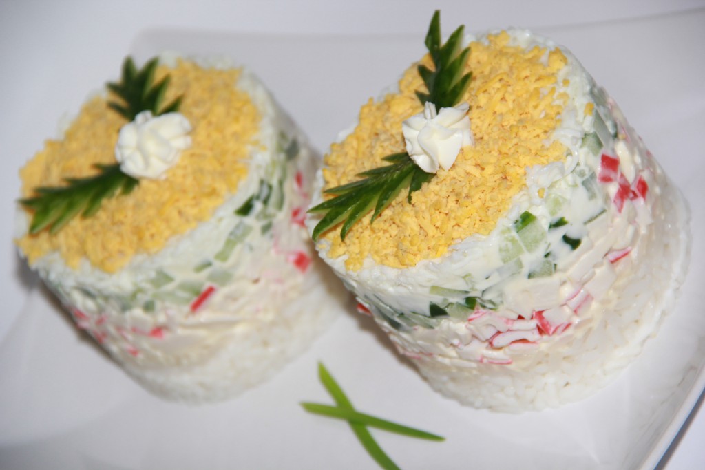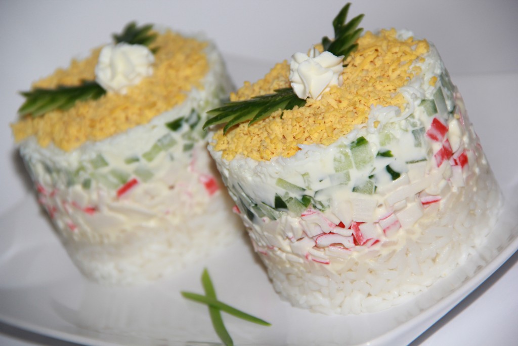 Хочу предложить рецепт салата "Суши", который готовится с крабовыми палочками и огурцами. Формируется это блюдо слоями, получается очень нежным и вкусным. Такой салат можно сделать порционно или в одном салатнике. Уверена, вкус этого салата, приготовленного из вполне доступных ингредиентов, понравится и вам, и вашим близким!