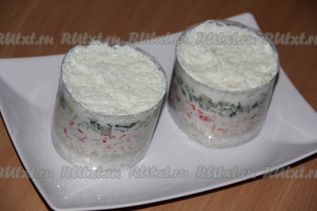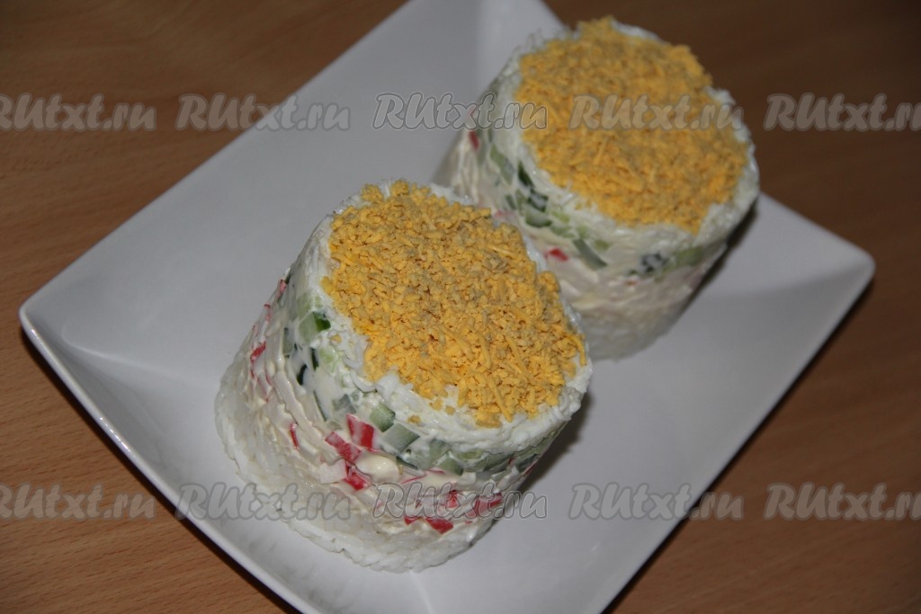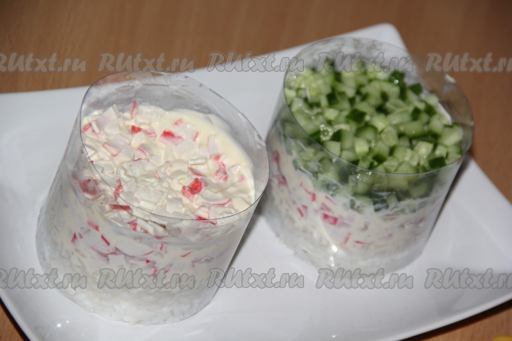 Крабовые палочки мелко нарезать, выложить поверх риса, смазать плавленным сыром, немного утрамбовать. Огурец вымыть, обсушить, нарезать на мелкие кубики, выложить поверх сыра, слегка утрамбовывать.
