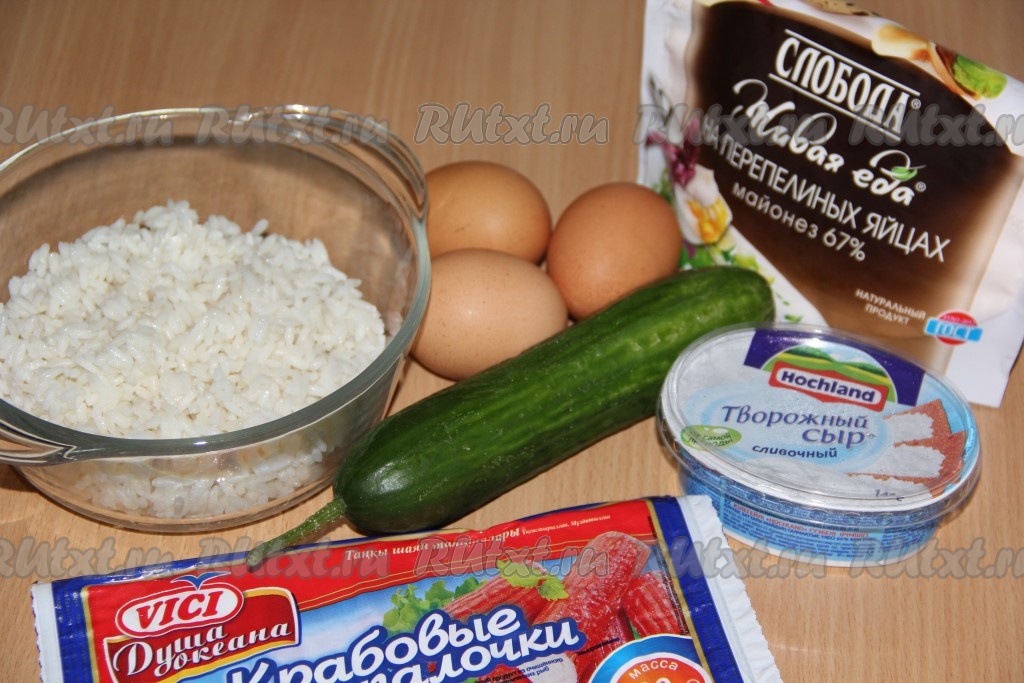 Рис выложить в сито, промыть под проточной водой. Затем переложить рис в кастрюлю с достаточно большим количеством кипящей подсоленной воды, дать снова воде закипеть, перемешать, убавить огонь до минимума, варить рис до готовности (минут 20-25), затем откинуть его на дуршлаг, лишней воде дать стечь, остудить. Сварить яйца вкрутую (в течение 10 минут с момента закипания воды), полностью остудить. Плавленный сыр для этого салата можно взять как творожный, так и сливочный. Если крабовые палочки заморожены, их нужно будет разморозить.