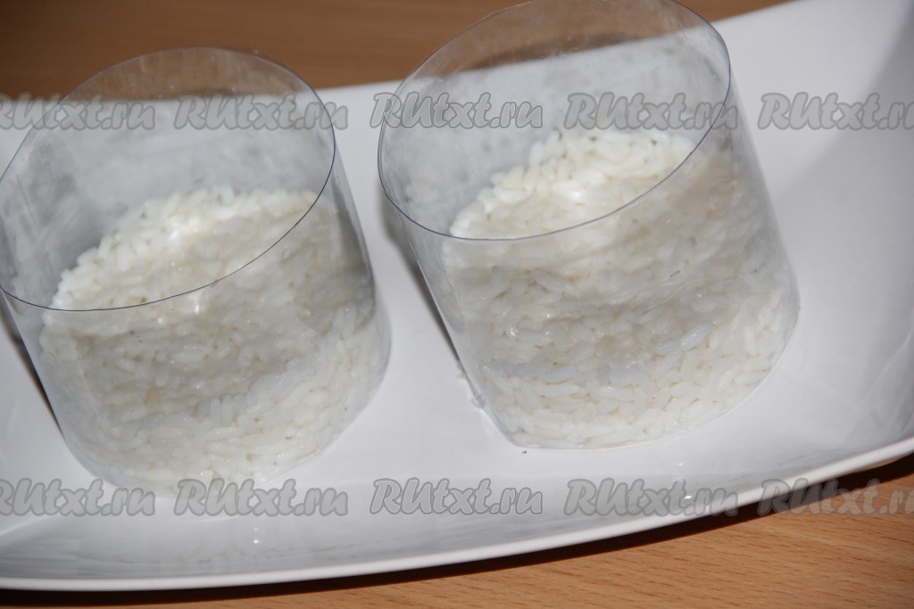 Я делала порционную подачу салата, для этого использовала 2 пластиковых бортика, но можно формировать и с помощью сервировочных колец. Также можно сформировать салат и в одном большом салатнике. Поскольку я делала 2 порции салата, поэтому и все составляющие салата равномерно раскладывала по 2 формам. На плоскую тарелку поставить бортики, на дно выложить рис, смазать майонезом, слегка утрамбовать.