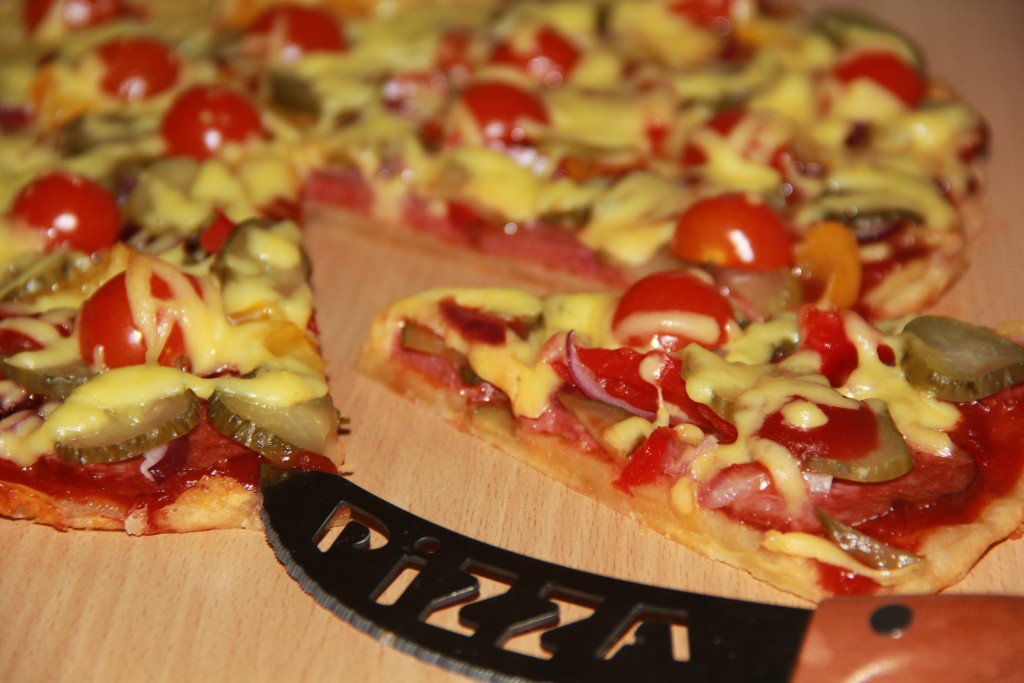 В моей семье любят всевозможные пиццы. Я часто делаю пиццу с разными начинками и на разной основе. Хочу поделиться удачным рецептом очень вкусной, аппетитной пиццы быстрого приготовления в духовке. Тесто замешивается без дрожжей. Пицца получается с тонкой основой. С начинкой можно экспериментировать. В этот раз я сделала начинку из полукопчёной колбасы, овощей и, конечно, сыра. Пицца получилась очень вкусной, в меру сочной, рекомендую!