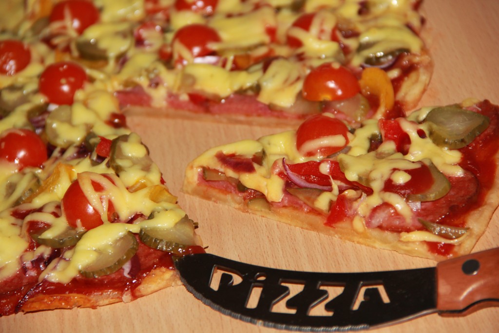 Готовую пиццу достать из духовки, дать остыть в течение нескольких минут и можно подавать к столу. Эта быстрая пицца, замешанная без добавления дрожжей, получается очень вкусной. В ней отлично сочетаются тонкая основа и сочная, аппетитная начинка. А полукопчёная колбаса сделала эту выпечку достаточно сытной и ароматной.