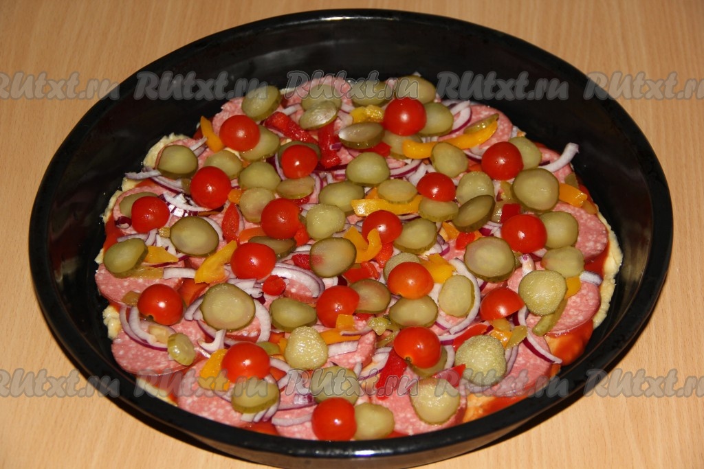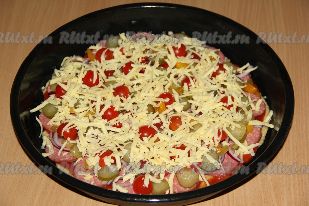 Посыпать пиццу сыром, натёртым на крупной тёрке, и поставить в разогретую духовку, выпекать при температуре 180 градусов, примерно, 15-20 минут.