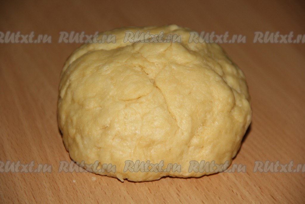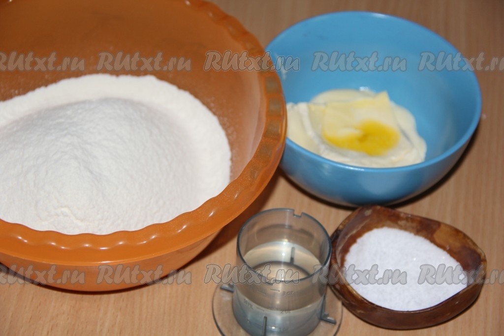 В миску влить воду комнатной температуры, добавить соль и растопленное сливочное масло (или маргарин), перемешать, затем частями всыпать муку, каждый раз тщательно вмешивая её в тесто. Тесто должно получиться эластичным, не липнущим к рукам.