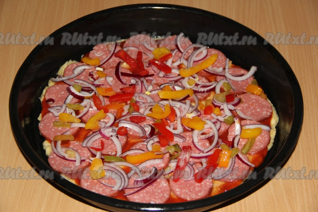 Луковицу очистить, удалить семена из болгарского перца. Лук и болгарский перец нарезать тонкой соломкой и выложить поверх колбасы.