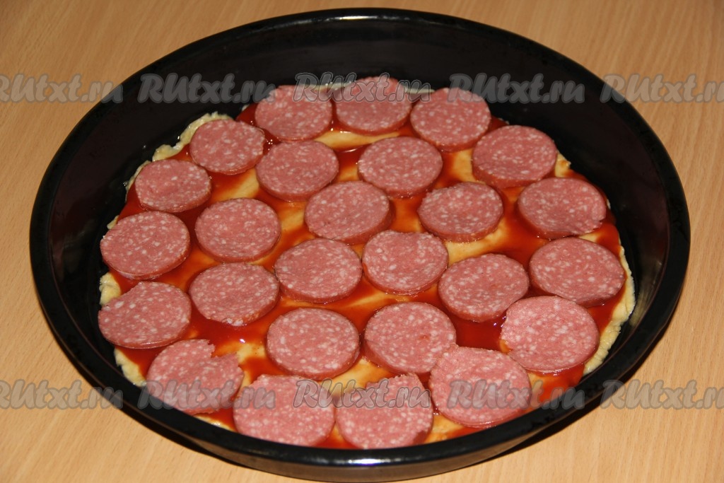 Основу для пиццы из бездрожжевого теста смазать томатным соусом, выложить тонкие кружочки колбасы.