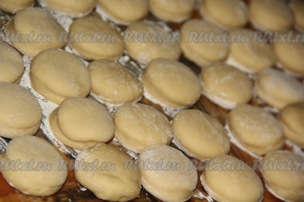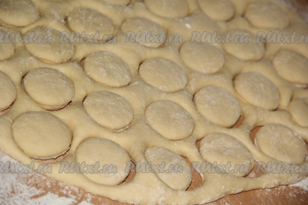 Готовое тесто хорошо обмять, раскатать скалкой в пласт толщиной примерно 1 см. Вырезать кружочки (я использовала маленький стаканчик).
