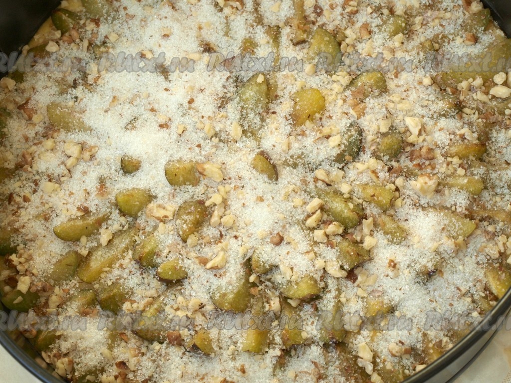 Порубить ножом грецкие орехи, смешать их с сахаром. Посыпать этой смесью сливы.