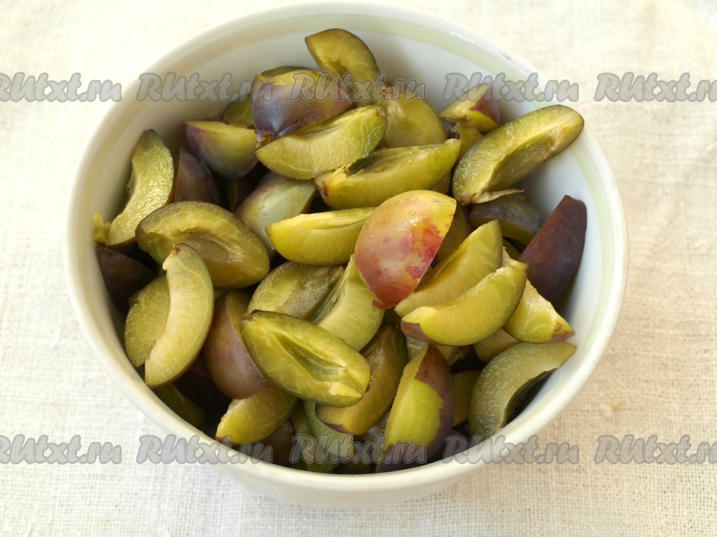 Сливы освободить от косточек и разрезать на 4-6 частей.