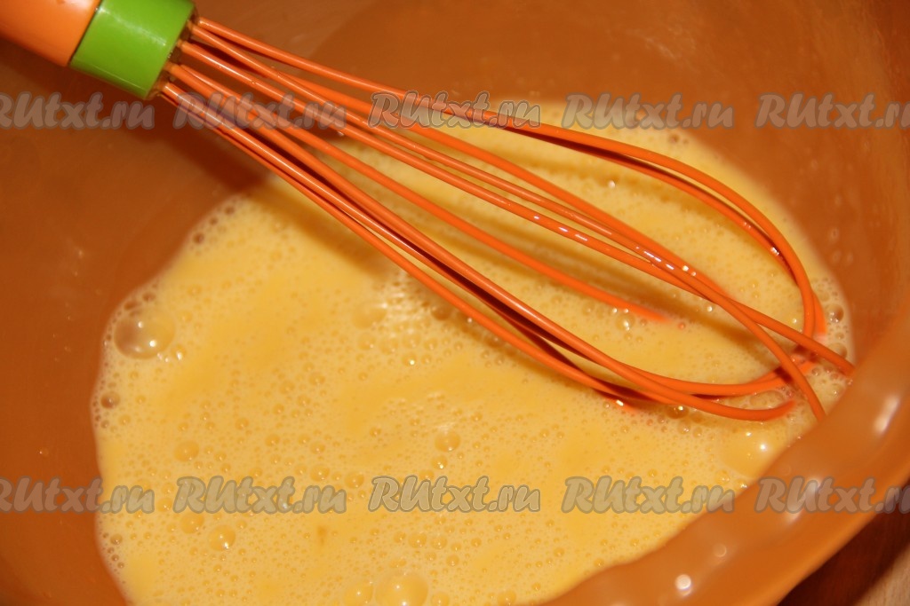С помощью венчика перемешать тесто, чтобы оно стало однородным, без комочков. Консистенция теста, как на обычные блины.