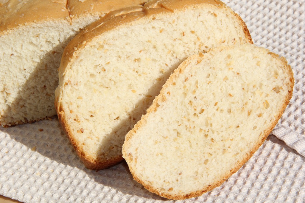 Белый хлеб на йогурте, приготовленный в хлебопечке с добавлением кунжута, остудить на решётке и можно подавать к столу.