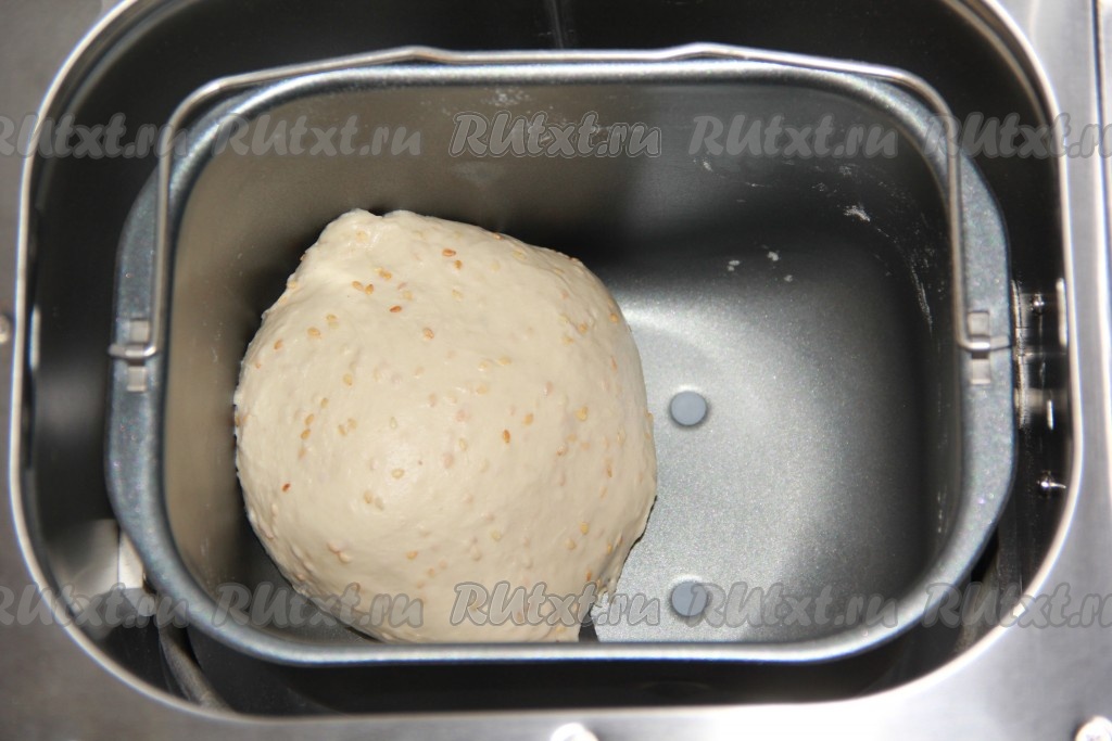 Далее всыпать муку. Соль и сахар всыпать по разным сторонам. Добавить кунжут и дрожжи.