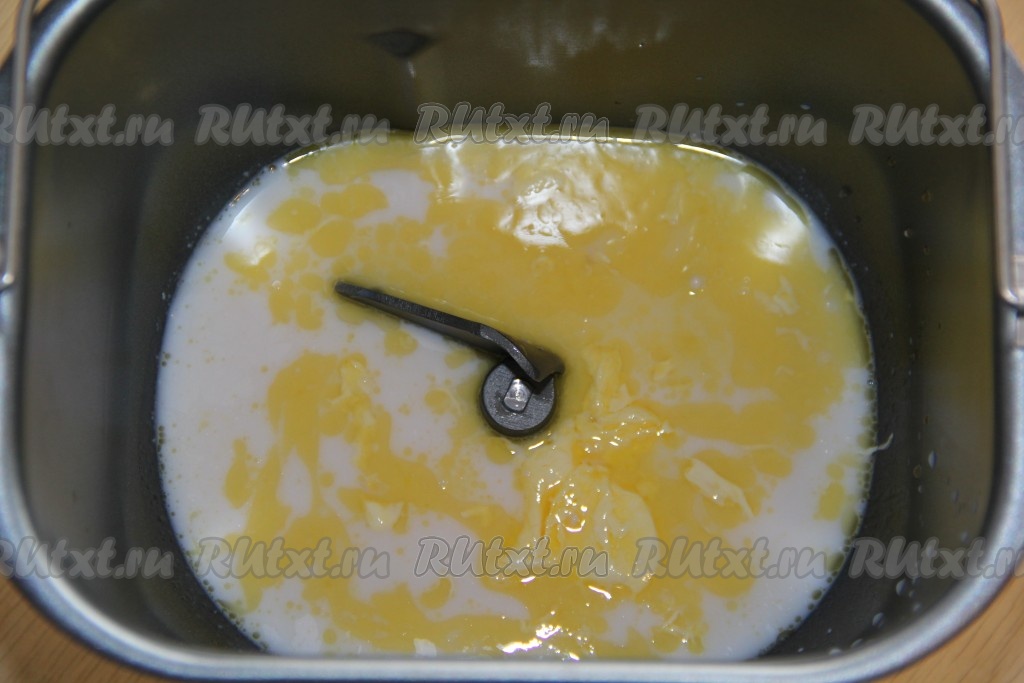 Молоко подогреть до 36 градусов, добавить йогурт и растопленный маргарин. Вылить полученную смесь в ведёрко хлебопечки.