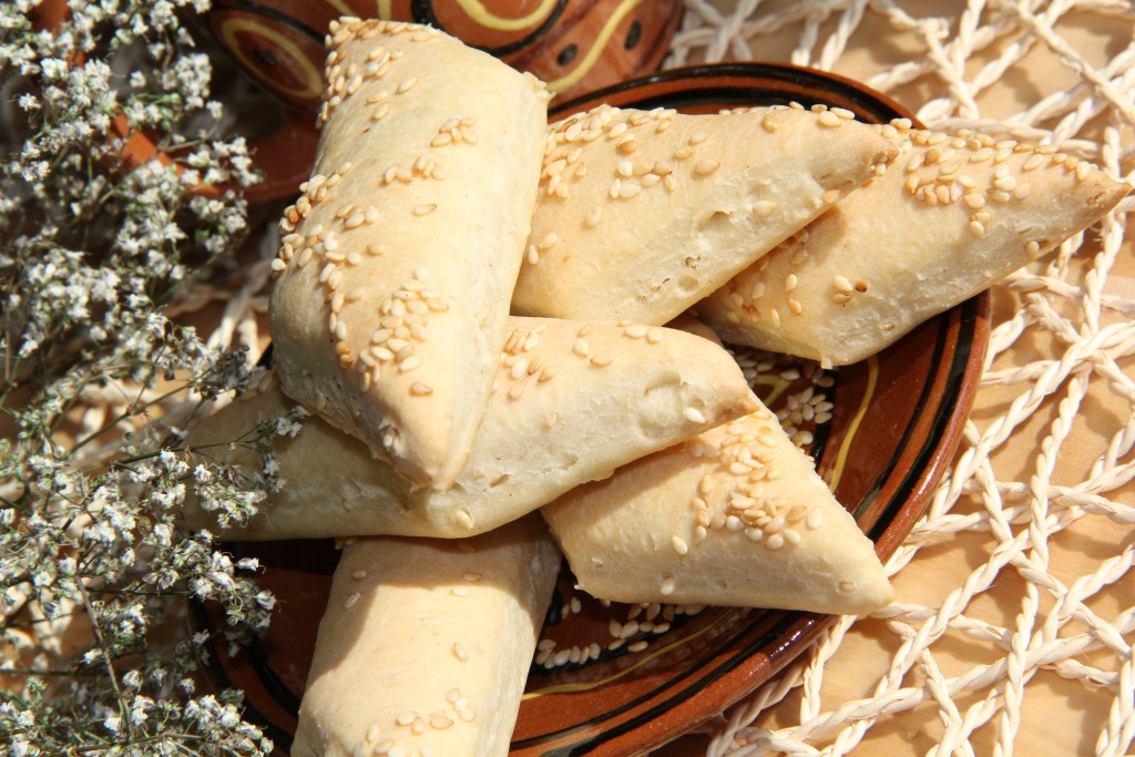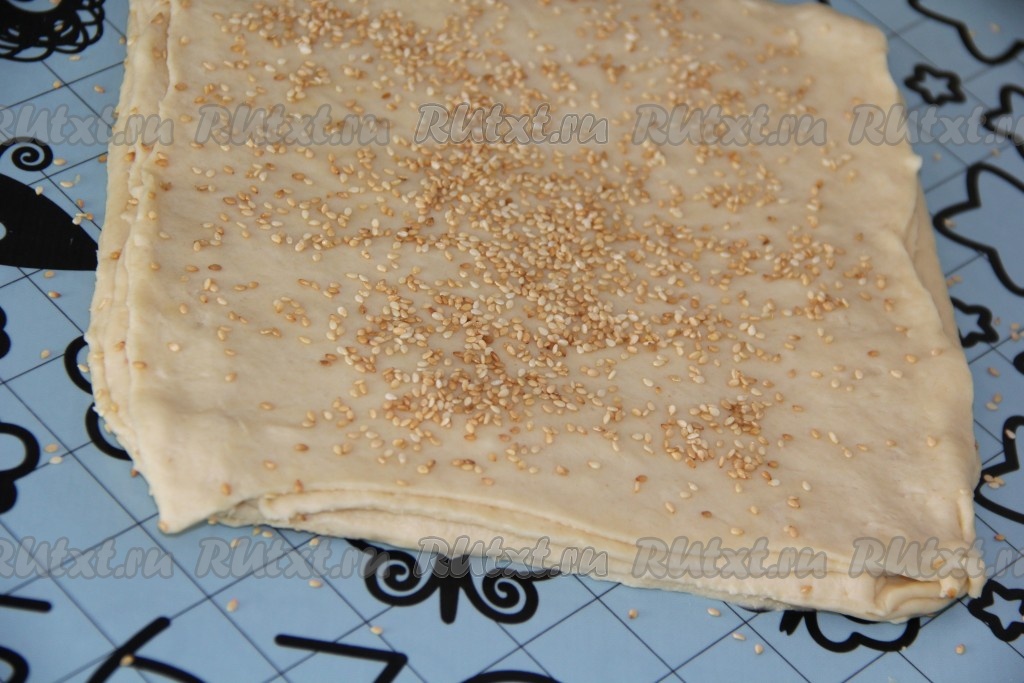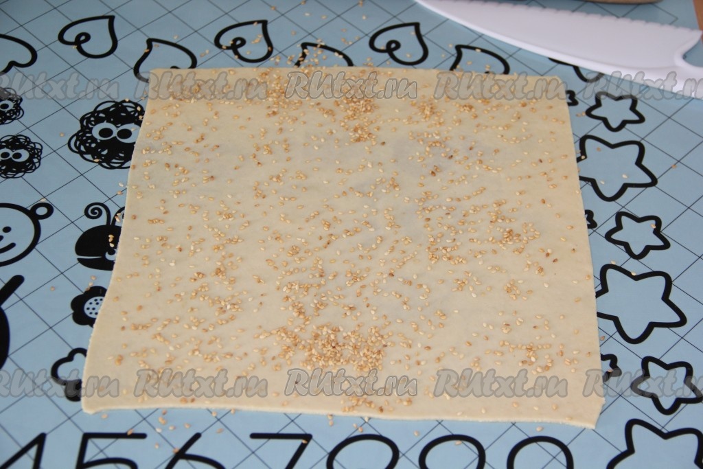 На присыпанной мукой поверхности вначале первую часть теста раскатать в достаточно тонкий прямоугольник. Можно воспользоваться ножом и выровнять края прямоугольника. Первый пласт теста посыпать кунжутом.